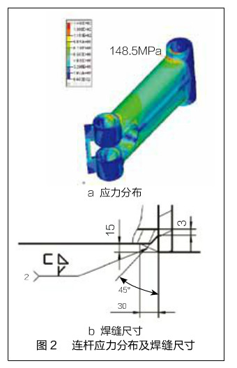 焊縫我們對連桿焊縫尺寸及焊接強(qiáng)度進(jìn)行分析,其焊縫結(jié)構(gòu)及尺寸滿足設(shè)計強(qiáng)度要求。連桿焊縫尺寸如圖2b所示。
