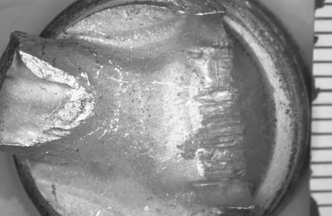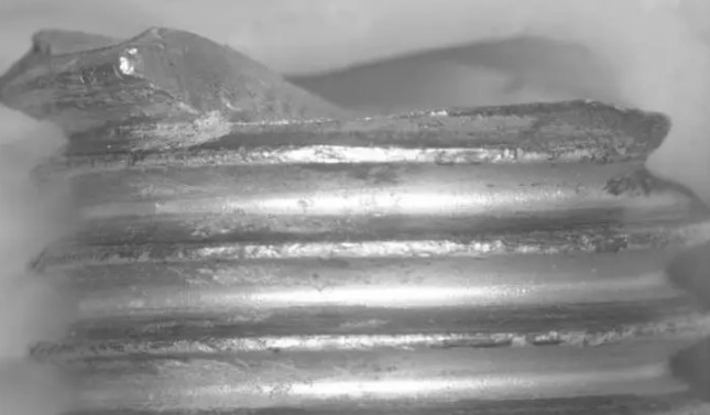 斷口穿過(guò)相鄰兩個(gè)螺紋的牙底和牙頂,斷面光亮呈金屬本色,未見(jiàn)明顯腐蝕產(chǎn)物及冶金缺陷,斷口附近可見(jiàn)明顯宏觀剪切塑性變形,斷口宏觀形貌,見(jiàn)圖15-20。