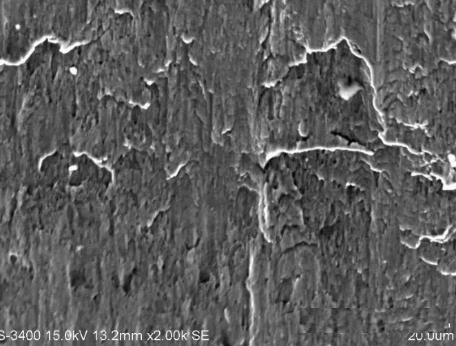 斷口形貌檢查發(fā)現(xiàn)螺紋底部存在微裂紋,微裂紋外側(cè)鍍層已破壞,說(shuō)明螺栓在安裝或服役之前是完好的,微裂紋只能是在成品螺栓安裝或服役過(guò)程中產(chǎn)生。
