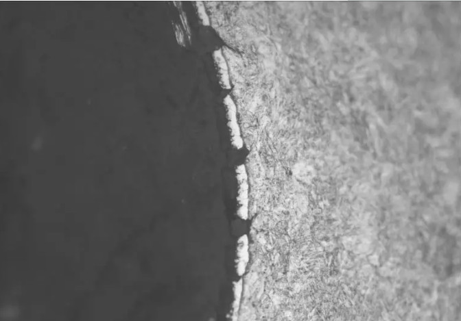 螺紋處金相組織碳勢(shì)正常(圖中白亮帶為鍍層),牙頂與牙底均未發(fā)現(xiàn)不連續(xù)性缺陷;見(jiàn)圖15-26。對(duì)斷裂件螺紋牙底的金相組織放大高倍檢查,牙底有微裂紋存在,且微裂紋外側(cè)鍍層已經(jīng)破壞,說(shuō)明微裂紋是在螺栓安裝或服役過(guò)程中產(chǎn)生的,見(jiàn)圖15-27。