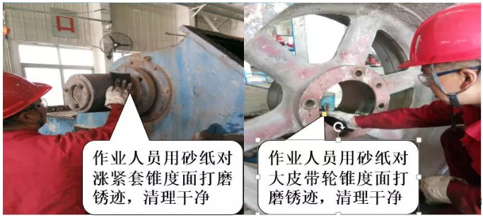 1、用砂紙打磨大皮帶輪和漲緊錐套的錐孔面。