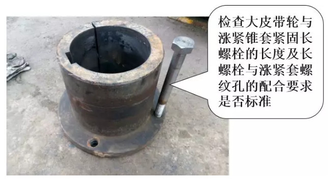 安裝漲緊錐套和大皮帶輪時(shí),注意使用自鎖和安裝螺栓的方法,不能使用游錘等其他工具安裝。另外大修泥漿泵發(fā)往井隊(duì)使用時(shí),需要注明皮帶輪與漲緊錐套檢查緊固要求。