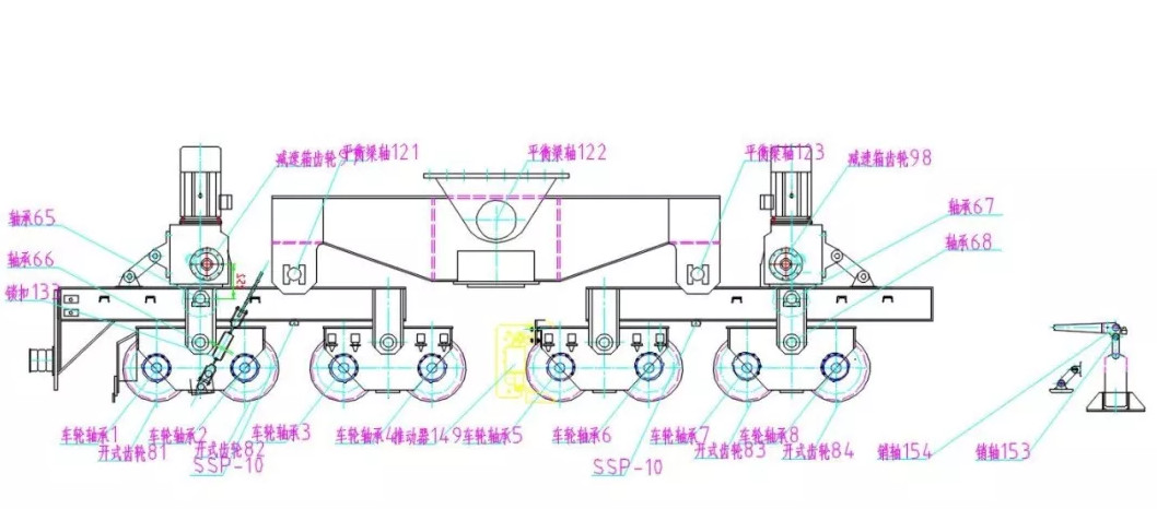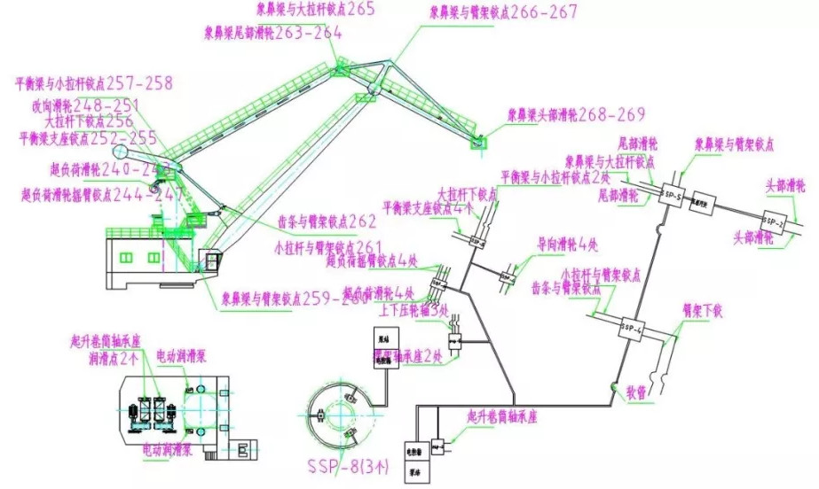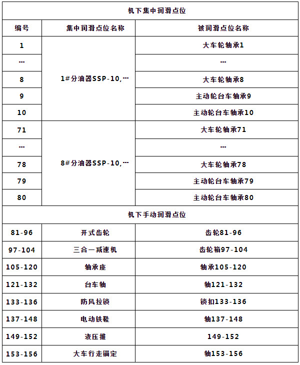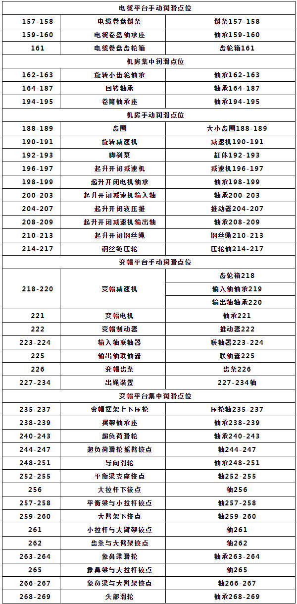 門機,共有269個潤滑點,有五種潤滑方式,包括集中潤滑泵(兩個),移動式集中潤滑泵(一個),油槍,涂抹,灌注。其中集中潤滑泵,移動式集中潤滑泵,油槍,涂抹用的是2#鋰基脂,俗稱黃油。集中潤滑泵潤滑包括電纜卷盤軸承座,旋轉小齒輪軸承、回轉軸承,卷筒軸承座,起升開閉電機軸承,起升開閉減速機輸入軸、輸出軸,鋼絲繩壓輪,變幅電機、聯軸器,出繩裝置,變幅擺架上下壓輪、擺架軸承座,滑輪、滑輪與搖臂絞點,導向滑輪,平衡梁支座絞點大拉桿下絞點,平衡梁與小拉桿絞點,大臂架下絞點,小拉桿、齒條與大臂架絞點象鼻梁滑輪,象鼻梁與大拉桿、大臂架絞點,頭部滑輪。移動集中潤滑包括大車車輪軸承、軸承座、軸。涂抹潤滑包括開式齒輪,防風拉鎖,大車行走錨定電纜卷盤鏈條,齒圈,起升開閉鋼絲繩,變幅齒條。灌注潤滑包括三合一減速機,起升開閉減速機與液壓推,變幅減速機,變幅制動器,腳剎泵油缸,電動鐵鞋液壓推動器,變幅減速機齒輪及電纜卷盤齒輪箱。其中減速機用的是220#齒輪油,液壓推動器用的是46#液壓油,腳剎泵油缸用的是7103/HZY3昆侖之星。