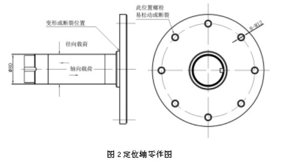 安全聯軸器定位軸法蘭采用8顆M12螺栓固定在電機側聯軸器上,當安全銷斷裂后用于支撐安全聯軸節的部分重量,并隨電機聯軸器減速轉動,Z終停轉后進行安全銷更換工作。在安全銷頻繁斷裂及停止轉動過程中,會產生一定的徑向跳動和軸向竄動,因此定位軸法蘭承受了較大的軸向力和徑向力。定位軸法蘭在兩個方向的沖擊載荷下,連接螺栓會產生松動或疲勞斷裂,甚至造成法蘭變形或定位軸斷裂,維修或更換定位軸造成大量停機時間。定位軸承受載荷情況及結構如圖2。
