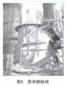 (3)預熱器系統下料管鎖風單翻板閥澆注料脫落燒損變形或閥板轉動不靈活卡住產生內漏風,導致鎖風翻板閥和管道受高溫氧化外表油漆脫落腐蝕見圖5。