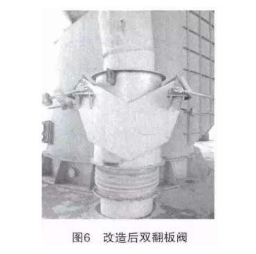 (3)檢修更換預熱器系統下料管燒損斷裂或變形壞閥板,對單翻板閥進行了改造,改造后雙翻板閥見圖6,避免內漏風短路,同時對各管道變形嚴重和破裂的膨脹節進行修復,對檢修孔門、儀表孔、管道閥門法蘭等密封嚴密,避免系統外漏風,減少系統阻力,降低能耗,降低高溫風機運轉負荷和轉速,減少了風機磨損。