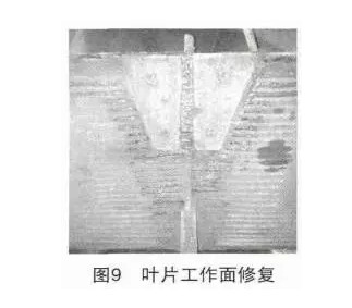 (1)轉子葉片各磨損區域清理、打磨,氣刨清除耐磨疲勞層,采取“8+6”堆焊耐磨鋼板補強修復葉片磨損嚴重部位見圖9,葉片其它工作面采取耐磨焊絲焊道堆焊。
