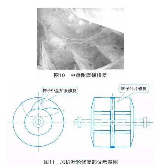 根據現場磨損情況,把原有磨損區清理打磨露出母材修復后保證結構強度,控制焊接應力和變形,保證風機正常運行生產。風機修復項目有轉子磨損中盤加強修復,轉子葉片和中盤交接耐磨鼻子、葉片工作面原耐磨焊道清理、上殼體磨損加強修復及耐磨處理。